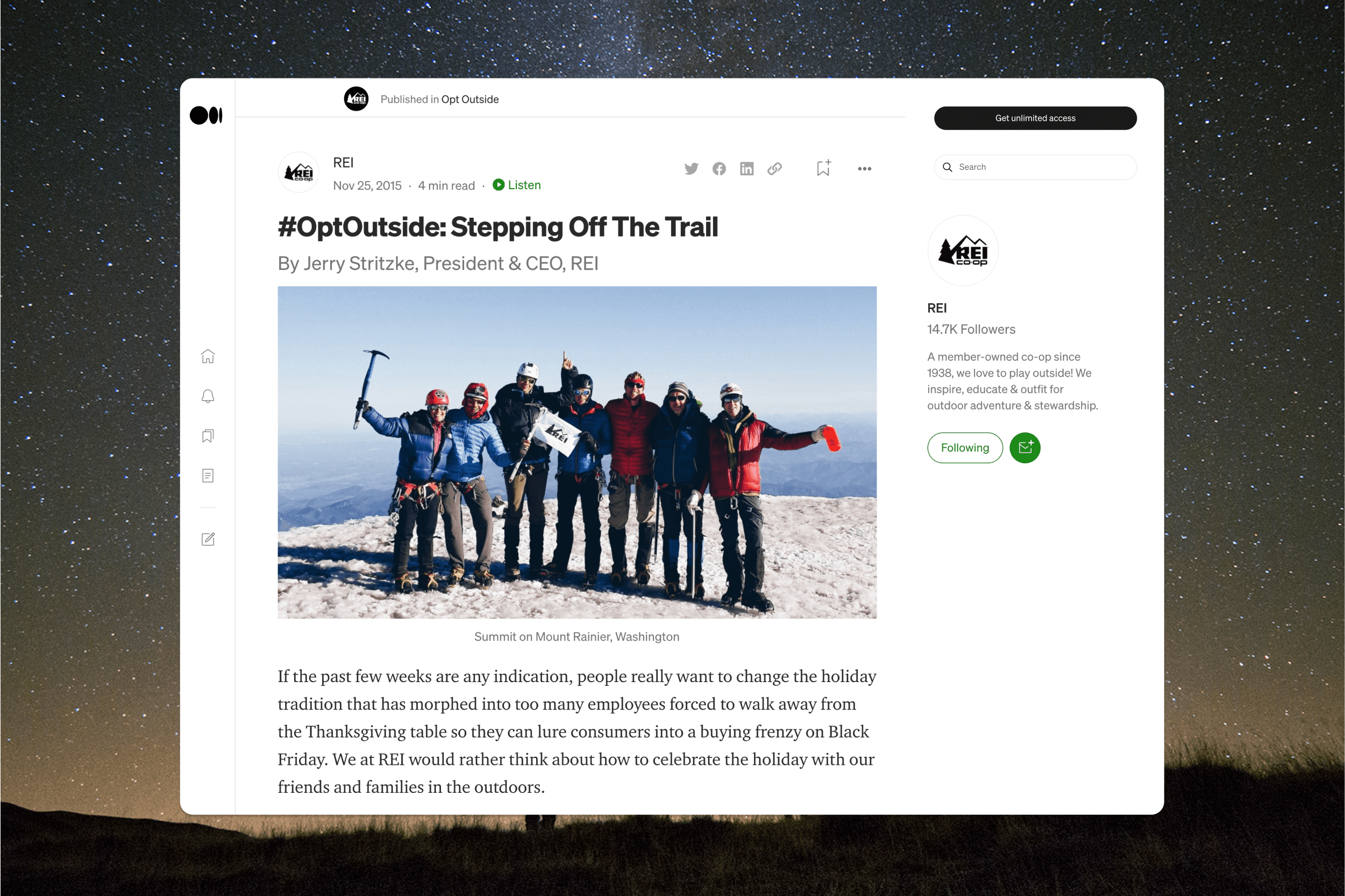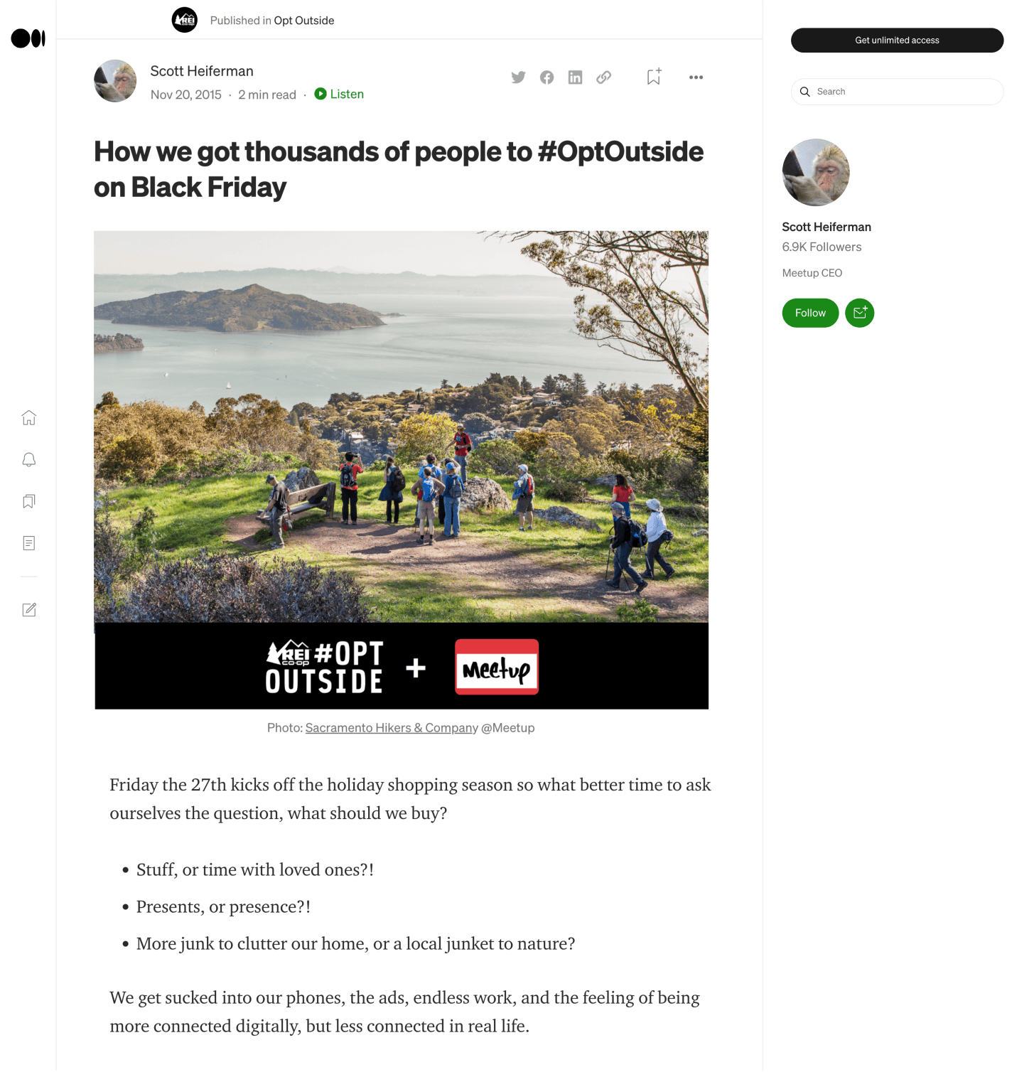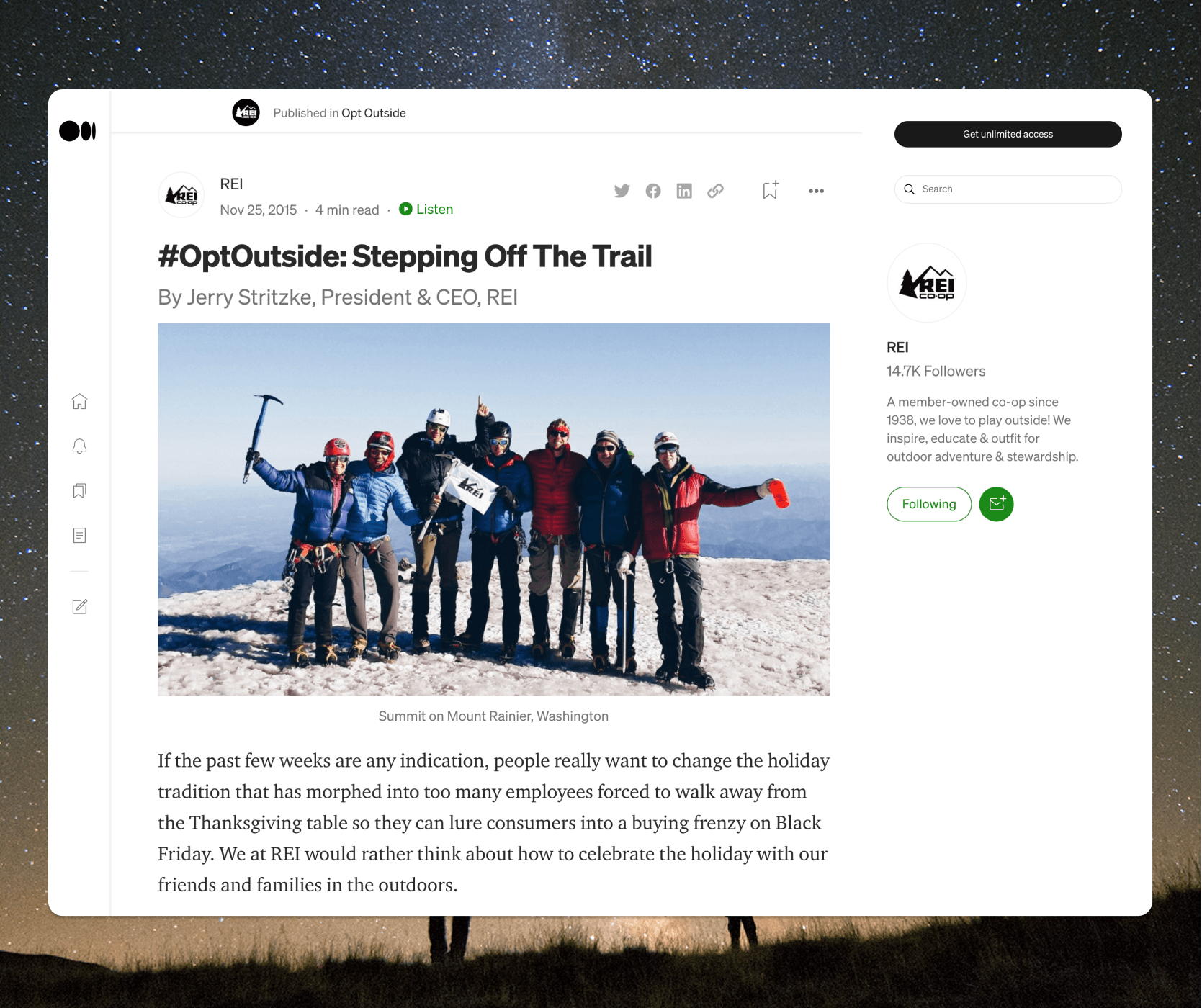 We helped the REI Co-Op demonstrate its commitment to the outdoors with an earned-centric announcement and a steady stream of authentic stories alongside real environmental stewardship commitments from the Co-Op. We developed a social response campaign, launched a branded online publication, and partnered with MeetUp to engage the REI community. Our contributions to the campaign bolstered REI’s ongoing commitment to the outdoors while encouraging others to participate in the movement to reclaim Black Friday for the outdoors and contributed to the campaign's many industry recognitions.